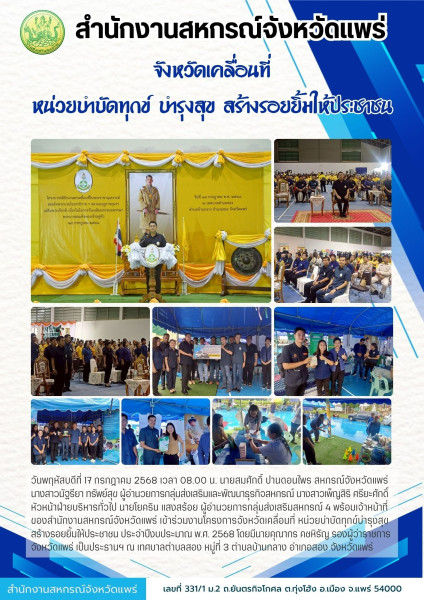 วันพฤหัสบดีที่ 17 กรกฎาคม 2568 เวลา 08.00 น. นายสมศักดิ์ ปานดอนไพร สหกรณ์จังหวัดแพร่ นางสาวนัฐรียา ทรัพย์สุข ผู้อำนวยการกลุ่มส่งเสริมและพัฒนาธุรกิจสหกรณ์ นางสาวเพ็ญสิริ ศรียะศักดิ์ หัวหน้าฝ่ายบริหารทั่วไป นายโยคริน แสงสร้อย ผู้อำนวยการกลุ่มส่งเสริมสหกรณ์ 4 พร้อมเจ้าหน้าที่ของสำนักงานสหกรณ์จังหวัดแพร่ เข้าร่วมงานโครงการจังหวัดเคลื่อนที่ หน่วยบำบัดทุกข์บำรุงสุข สร้างรอยยิ้มให้ประชาชน ประจำปีงบประมาณ พ.ศ. 2568 โดยมีนายคุณากร คชหิรัญ รองผู้ว่าราชการจังหวัดแพร่ เป็นประธานฯ ณ เทศบาลตำบลสอง หมู่ที่ 3 ตำบลบ้านกลาง อำเภอสอง จังหวัดแพร่