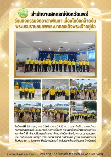 วันจันทร์ที่ 28 กรกฎาคม 2568 เวลา 09.15 น. นายสมศักดิ์ ปานดอนไพร สหกรณ์จังหวัดแพร่ มอบหมายให้นางสาวเพ็ญสิรี ศรียะศักดิ์ หัวหน้าฝ่ายบริหารทั่วไป และเจ้าหน้าที่ เข้าร่วมกิจกรรมจิตอาสาพัฒนา ในวันคล้ายวันพระบรมราชสมภพพระบาทสมเด็จพระเจ้าอยู่หัว โดยมีนายสมชัย เลิศประสิทธิพันธ์ ผู้ว่าราชการจังหวัดแพร่ เป็นประธานฯ ณ วัดพระบาทมิ่งเมืองวรวิหาร ตำบลในเวียง อำเภอเมืองแพร่ จังหวัดแพร่