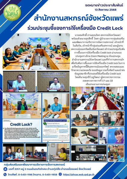 วันที่ 13 สิงหาคม 2568 นายสมศักดิ์ ปานดอนไพร สหกรณ์จังหวัดแพร่ พร้อมด้วยนายสุรสิทธิ์ ใจตา ผู้อำนวยการกลุ่มส่งเสริมและพัฒนาการบริหารการจัดการสหกรณ์ เจ้าหน้าที่ในสังกัด, เจ้าหน้าที่กลุ่มส่งเสริมสหกรณ์ และผู้แทนสหกรณ์ออมทรัพย์ในจังหวัดแพร่ เข้าร่วมประชุมรับฟังการชี้แจงการใช้เครื่องมือ Credit lock ผ่านระบบประชุมทางไกล Zoom Meeting ณ ห้องประชุมสำนักงานสหกรณ์จังหวัดแพร่ และที่ทำการสหกรณ์ฯ เพื่อรับฟังการชี้แจงการใช้เครื่องมือ Credit lock ในการแก้ไขปัญหาหนี้สินสหกรณ์ออมทรัพย์ ตรวจสอบและรักษาความปลอดภัยของข้อมูล รวมทั้งจัดทำและนำส่งข้อมูลสมาชิกที่ประสงค์ใช้เครื่องมือ Credit lock โดยมีนายศุภธีร์ อยู่วัฒนา ผู้ตรวจราชการกรม เขตตรวจราชการที่ 17 และ 18 เป็นประธานการประชุมฯ