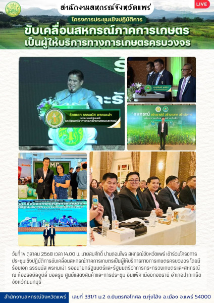 วันที่ 14 ตุลาคม 2568 เวลา 14.00 น. นายสมศักดิ์ ปานดอนไพร สหกรณ์จังหวัดแพร่ เข้าร่วมโครงการประชุมเชิงปฏิบัติการขับเคลื่อนสหกรณ์ภาคการเกษตรเป็นผู้ให้บริการทางการเกษตรครบวงจร โดยมีร้อยเอก ธรรมนัส พรหมเผ่า รองนายกรัฐมนตรีและรัฐมนตรีว่าการกระทรวงเกษตรและสหกรณ์ เป็นประธาน ณ ห้องรอยัลจูบิลี่ บอลรูม ศูนย์แสดงสินค้าและการประชุม อิมแพ็ค เมืองทองธานี อำเภอปากเกร็ด จังหวัดนนทบุรี