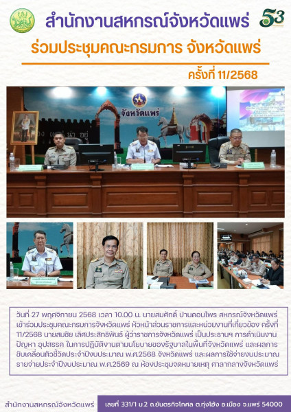วันที่ 27 พฤศจิกายน 2568 เวลา 10.00 น. นายสมศักดิ์ ปานดอนไพร สหกรณ์จังหวัดแพร่ เข้าร่วมประชุมคณะกรมการจังหวัดแพร่ หัวหน้าส่วนราชการและหน่วยงานที่เกี่ยวข้อง ครั้งที่ 11/2568 นายสมชัย เลิศประสิทธิพันธ์ ผู้ว่าราชการจังหวัดแพร่่ เป็นประธานฯ การดำเนินงาน ปัญหา อุปสรรค ในการปฏิบัติงานตามนโยบายของรัฐบาลในพื้นที่จังหวัดแพร่ และผลการขับเคลื่อนตัวชี้วัดประจำปีงบประมาณ พ.ศ.2568 จังหวัดแพร่ และผลการใช้จ่ายงบประมาณรายจ่ายประจำปีงบประมาณ พ.ศ.2569 ณ ห้องประชุมจดหมายเหตุ ศาลากลางจังหวัดแพร่