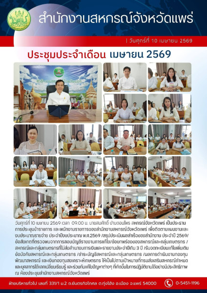 วันศุกร์ที่ 10 เมษายน 2569 เวลา 09.00 น. นายสมศักดิ์ ปานดอนไพร สหกรณ์จังหวัดแพร่ เป็นประธาน การประชุมข้าราชการ และพนักงานราชการของสำนักงานสหกรณ์จังหวัดแพร่ เพื่อติดตามแผนงานและงบประมาณรายจ่าย ประจำปีงบประมาณ พ.ศ.2569 /สรุปประเมินผลสำเร็จของสำนักงาน ประจำปี 2569/ข้อสังเกตที่ตรวจพบจากการสอบบัญชีรายงานการแก้ไข/ข้อบกพร่องของสหกรณ์และกลุ่มเกษตรกร /สหกรณ์และกลุ่มเกษตรกรที่ไม่ส่งสำเนางบการเงินและรายงานประจำปีเกิน 3 ปี /รับจดทะเบียนแก้ไขเพิ่มเติมข้อบังคับสหกรณ์และกลุ่มเกษตรกร /ชำระบัญชีสหกรณ์และกลุ่มเกษตรกร /ผลการดำเนินงานกองทุนพัฒนาสหกรณ์ และเงินกองทุนสงเคราะห์เกษตรกร ให้เป็นไปตามเป้าหมายที่กรมส่งเสริมสหกรณ์กำหนด และบุคลากรได้แลกเปลี่ยนเรียนรู้ และร่วมกันแก้ไขปัญหาต่างๆ ที่เกิดขึ้นในการปฏิบัติงานได้อย่างมีประสิทธิภาพ ณ ห้องประชุมสำนักงานสหกรณ์จังหวัดแพร่