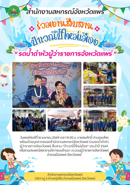 วันพฤหัสบดีที่ 16 เมษายน 2569 เวลา 15.00 น. นายสมศักดิ์ ปานดอนไพร พร้อมด้วยบุคลากรของสำนักงานสหกรณ์จังหวัดแพร่ ร่วมรดน้ำดำหัว ผู้ว่าราชการจังหวัดแพร่ สืบสาน “ป๋าเวณีปี๋ใหม่เมือง” ประจำปี 2569 หรืองานประเพณีสงกรานต์ตามแบบล้านนา โดยมีนายสมชัย เลิศประพันธ์ ผู้ว่าราชการจังหวัดแพร่ เป็นผู้รับรดน้ำดำหัว ณ จวนผู้ว่าราชการจังหวัดแพร่ อำเภอเมืองแพร่ จังหวัดแพร่