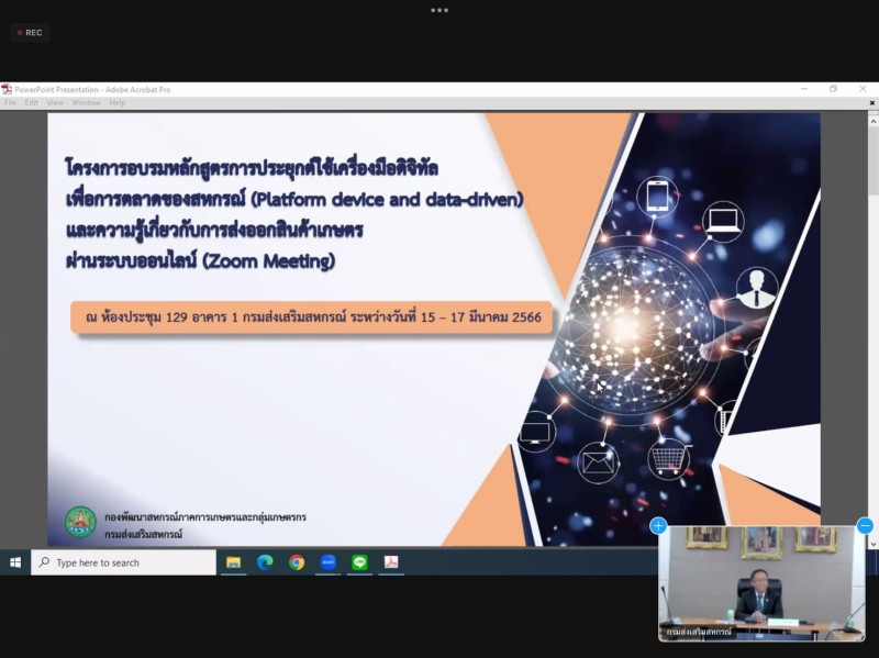 วันที่15-17 มีนาคม 2566 นายสมศักดิ์ ปานดอนไพร สหกรณ์จังหวัดแพร่ มอบหมายให้นายสุรสิทธิ์ ใจตา ผอ.กลุ่มส่งเสริมและพัฒนาธุรกิจสหกรณ์ นางสาววัชราภรณ์ เกิดโต นักวิชาการสหกรณ์ปฏิบัติการ พร้อมด้วยสหกรณ์การเกษตรสูงเม่น จำกัด ซึ่งเป็นสหกรณ์เป้าหมายของจังหวัดแพร่ เข้าร่วมอบรมโครงการอบรมหลักสูตรการประยุกต์ใช้เครื่องมือดิจิทัลเพื่อการตลาดของสหกรณ์และความรู้เกี่ยวกับการส่งออกสินค้าเกษตร (Platform device and data-driven)ภายใต้โครงการยกระดับสถาบันเกษตรกรให้เป็นผู้ประกอบการธุรกิจเกษตร ผ่านระบบออนไลน์(Zoom meeting)โดยมีนายอัชฌา สุวรรณนิตย์ รองอธิบดีกรมส่งเสริมสหกรณ์เป็นประธานการอบรม