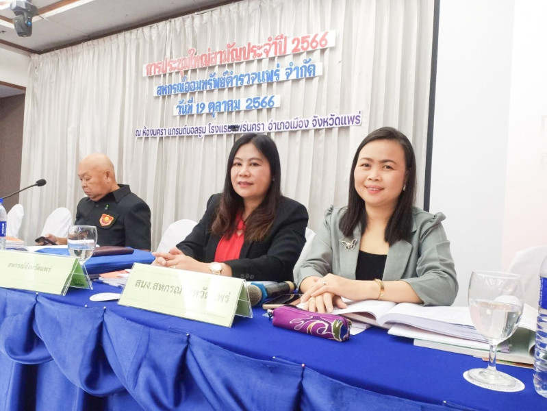 วันที่ 19 ตุลาคม 2566 นายสมศักดิ์ ปานดอนไพร สหกรณ์จังหวัดแพร่, นางสาวนัฐรียา ทรัพย์สุข ผู้อำนวยการกลุ่มส่งเสริมและพัฒนาการบริหารจัดการสหกรณ์ พร้อมด้วยนางสาวนฤมล คำทอง ผู้อำนวยการกลุ่มส่งเสริมสหกรณ์ 1 และนางสาวลำดวน กากุล นักวิชาการสหกรณ์ปฏิบัติการ เข้าร่วมประชุมใหญ่สามัญประจำปี 2566 สหกรณ์ออมทรัพย์ตำรวจแพร่ จำกัด เพื่อให้ที่ประชุมใหญ่ร่วมกันพิจารณาอนุมัติงบการเงินประจำปี, พิจารณาจัดสรรกำไรสุทธิ, พิจารณาอนุมัติแผนงานและงบประมาณประจำปี 2567,